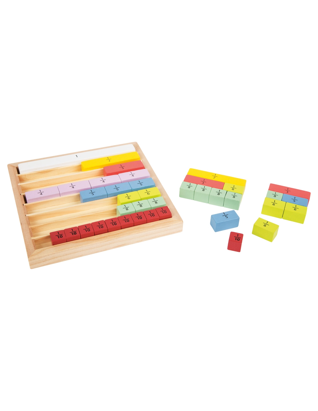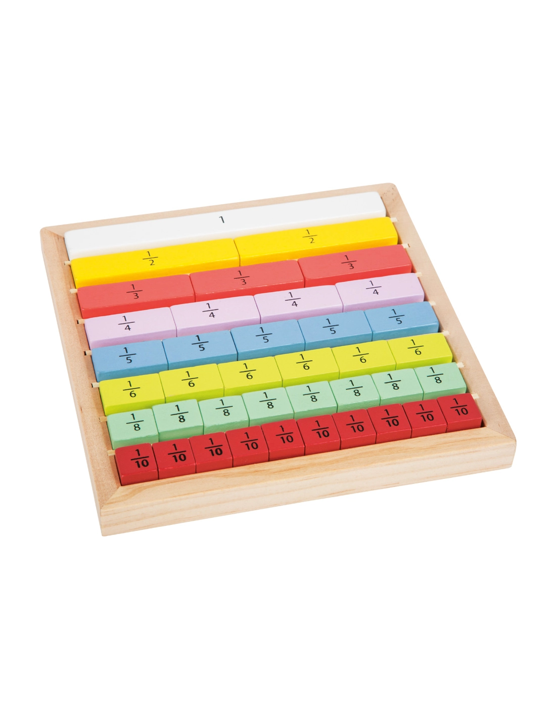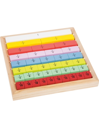 Un set de fractions magnétiques linéaires. Inclue les fractions de 1/2 à 1/12, un barre entière pour référence à l'entier coupé en...