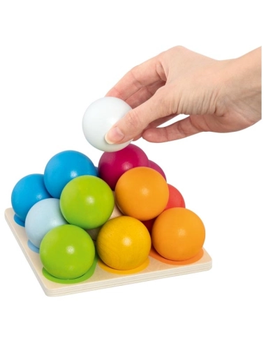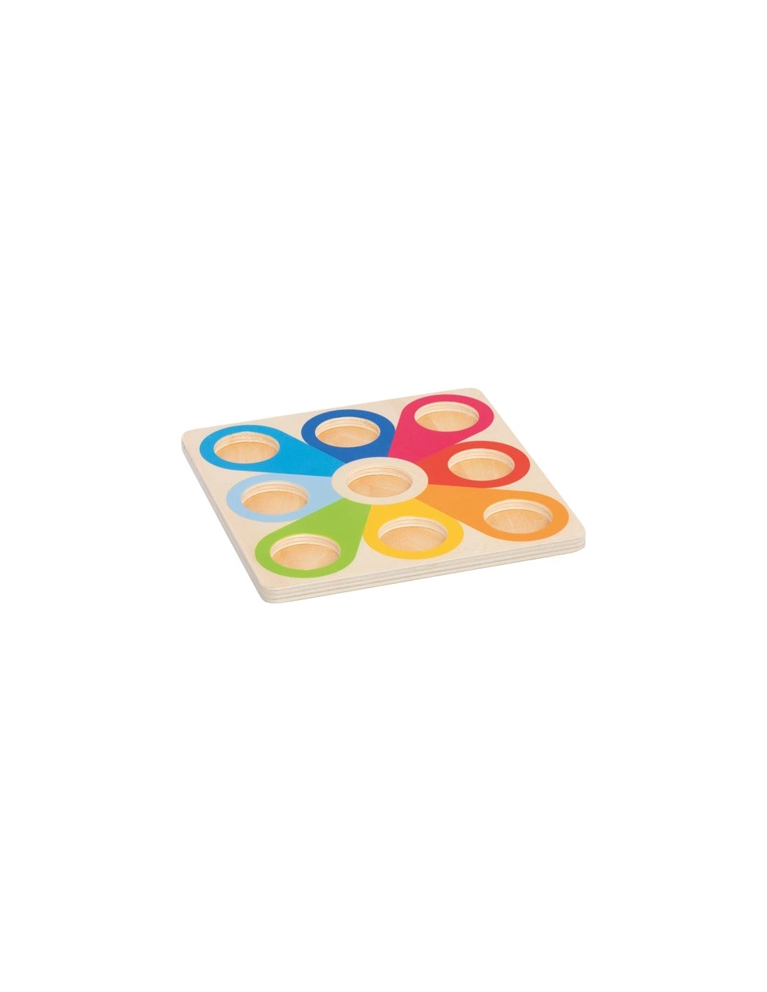 Cette tour arc-en-ciel propose 10 disques en bois à enfiler sur la tige avec une base vacillante. Pour proposer un travail de la motricité fine, celle-ci comporte des petits cônes sur la tige. L'enfant doit alors tourner pour que le disque s'encastre correctement.