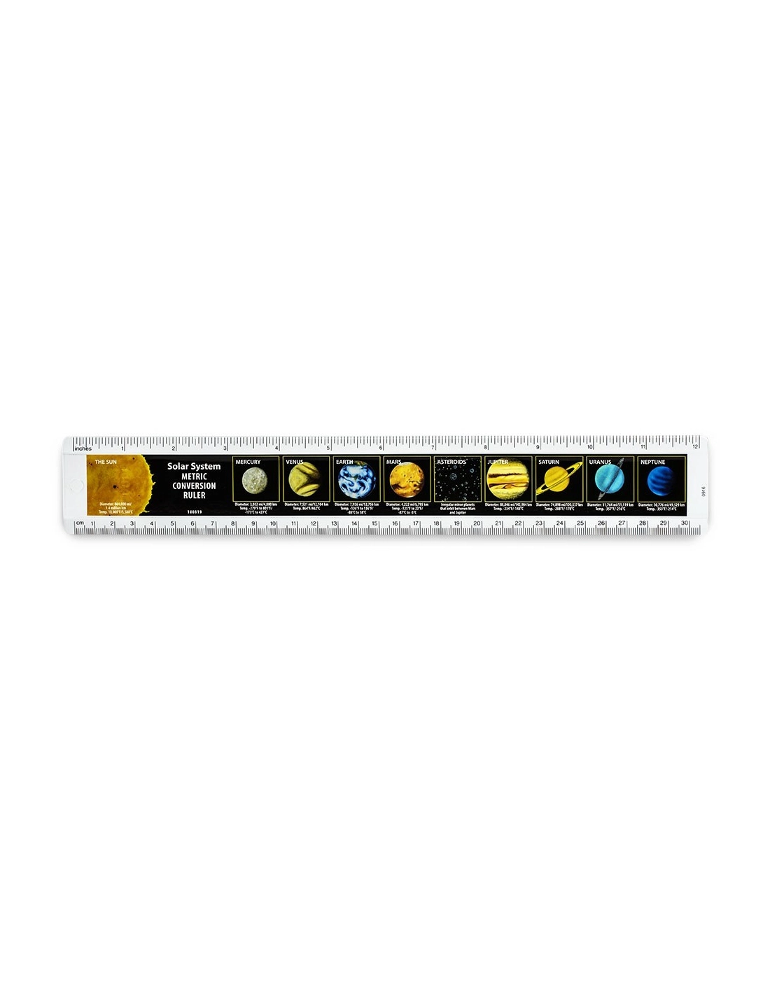 La règle du système solaire représente le soleil, les huit planètes et la ceinture d’astéroïdes. Les planètes sont illustrées dans l’ordre, avec des couleurs réalistes, et accompagnées d’informations sur leur taille et leur température.