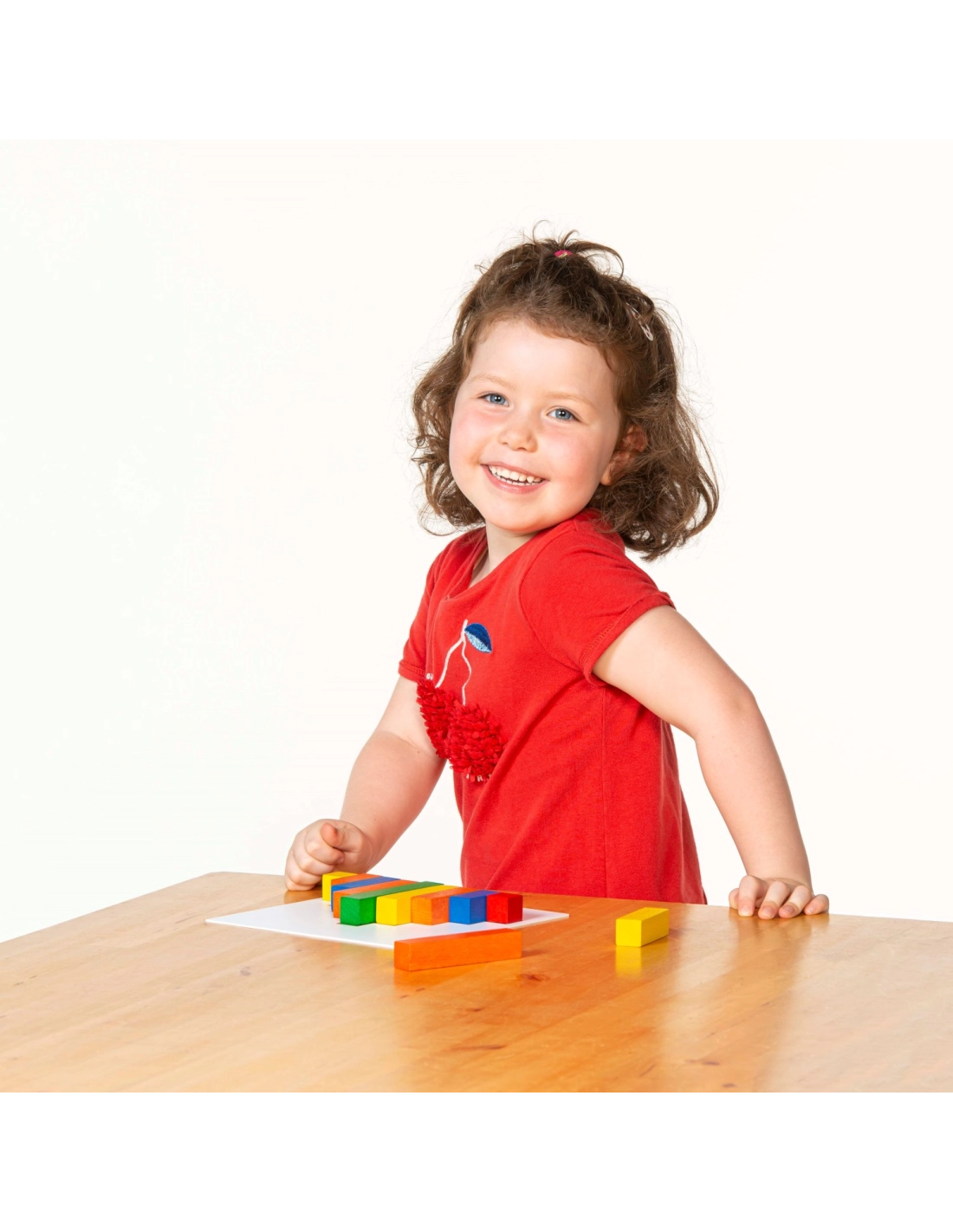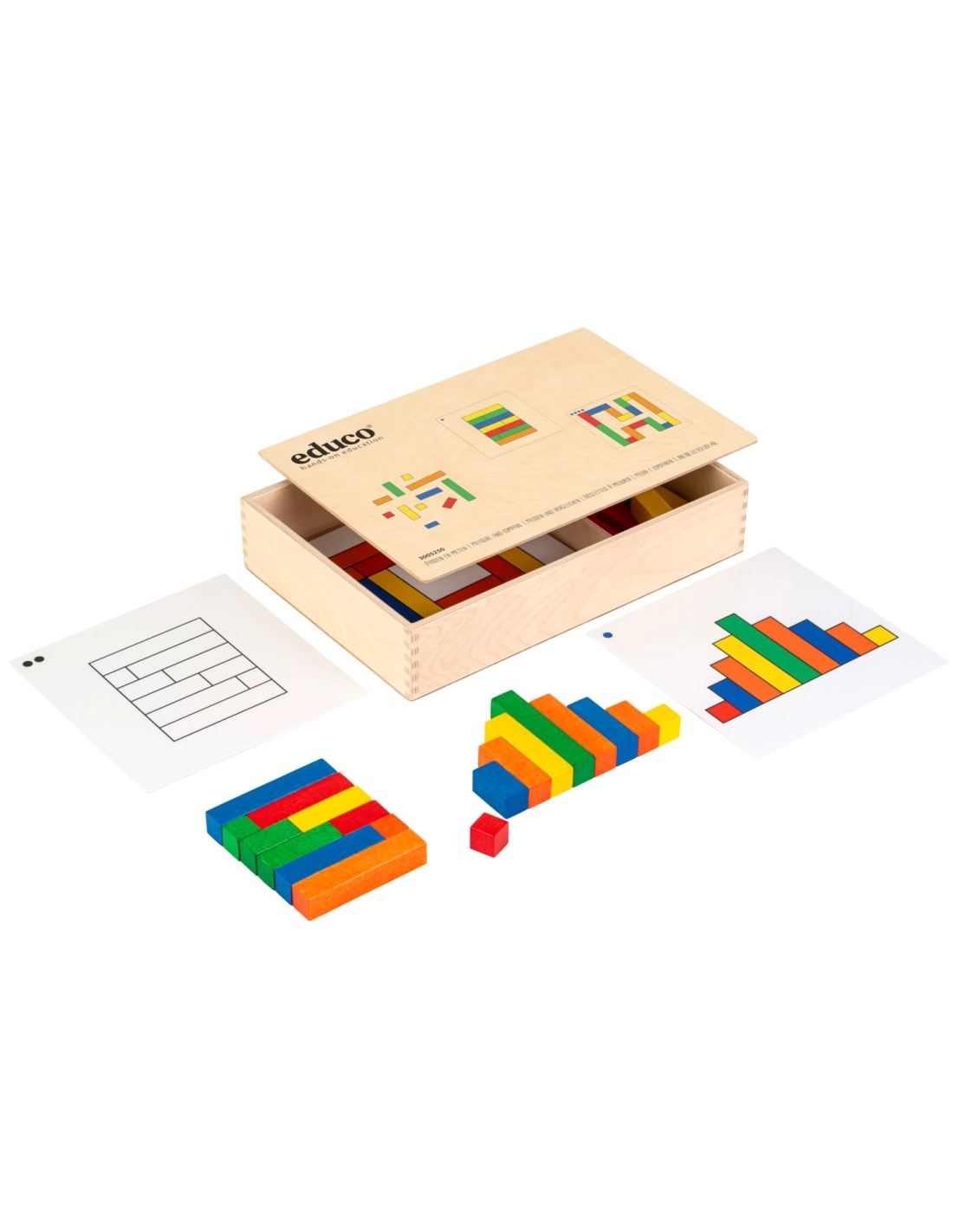 Pour les exercices avec seulement des contours, les enfants peuvent choisir les couleurs et les longueurs qu’ils veulent utiliser. Les blocs sont en bois et ont des dimensions allant de 1 à 10 cm.