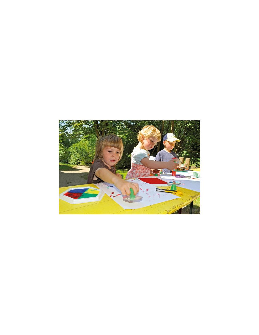 Un set complet, autonome et solide — les tampons sont larges (Ø 7,5 cm), faciles à tenir pour les petites mains, et les deux types d'activités permettent de moduler selon les âges et les niveaux du groupe.