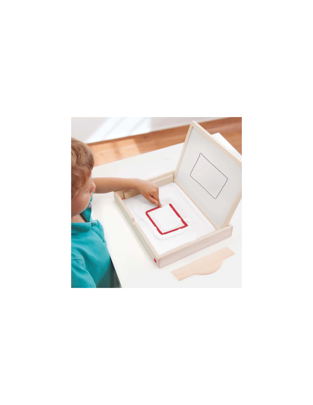Versez le sel dans le plateau, nivelez avec le lisseur, puis guidez l'enfant pour tracer des formes avec son doigt, ressentant la texture et visualisant son tracé.