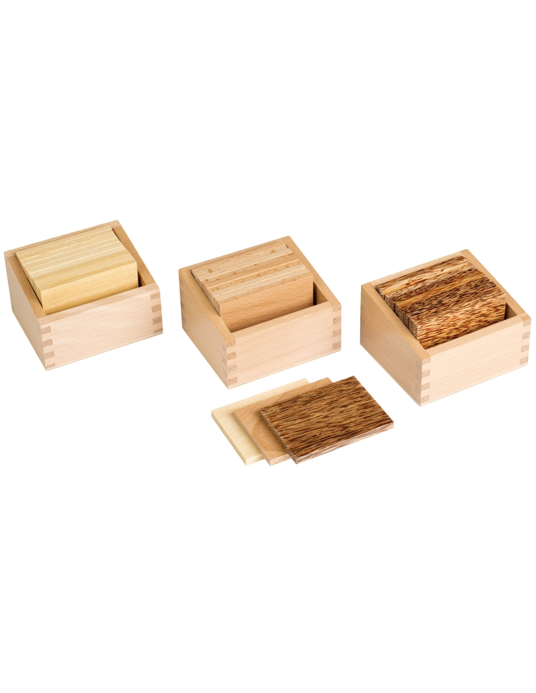Se compose d'une boîte en bois divisée en 6 compartiments contenant six paires de tablettes de 8 x 4 cm en feutre, bois, acier, liège, verre et marbre.