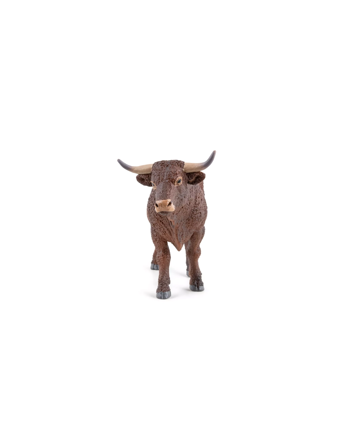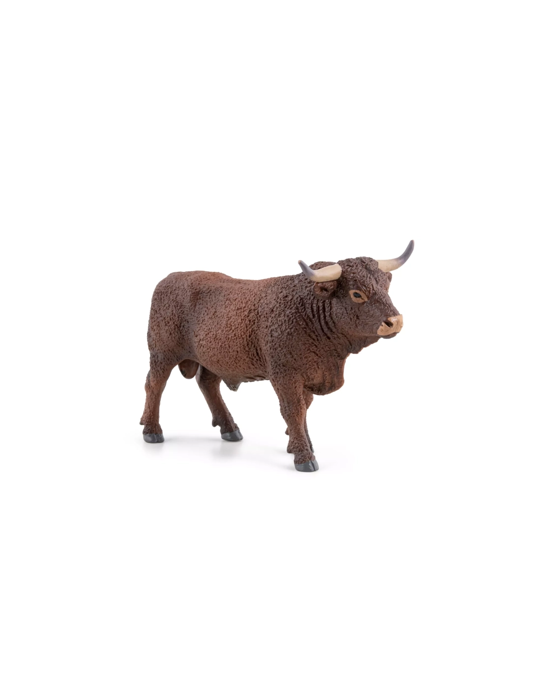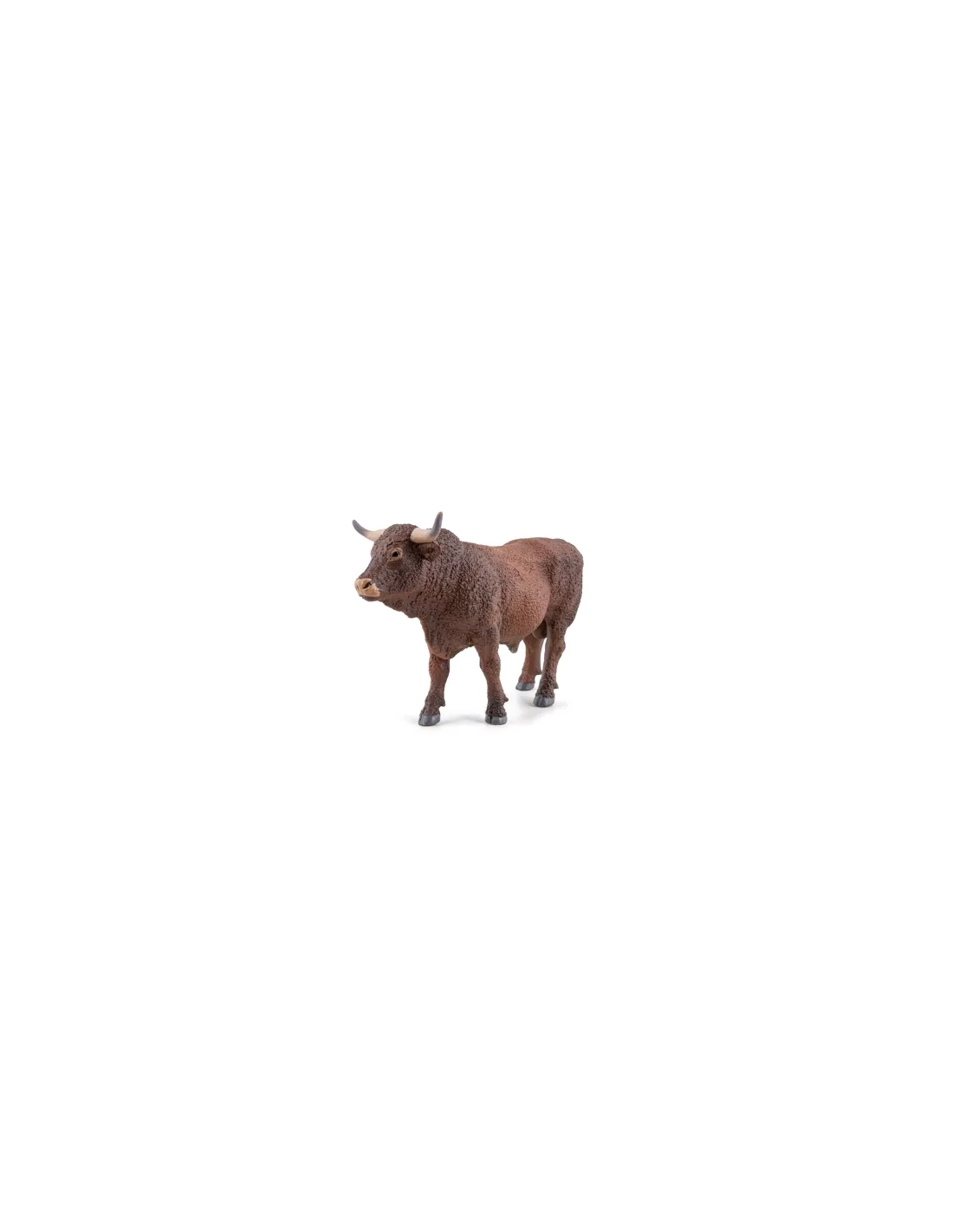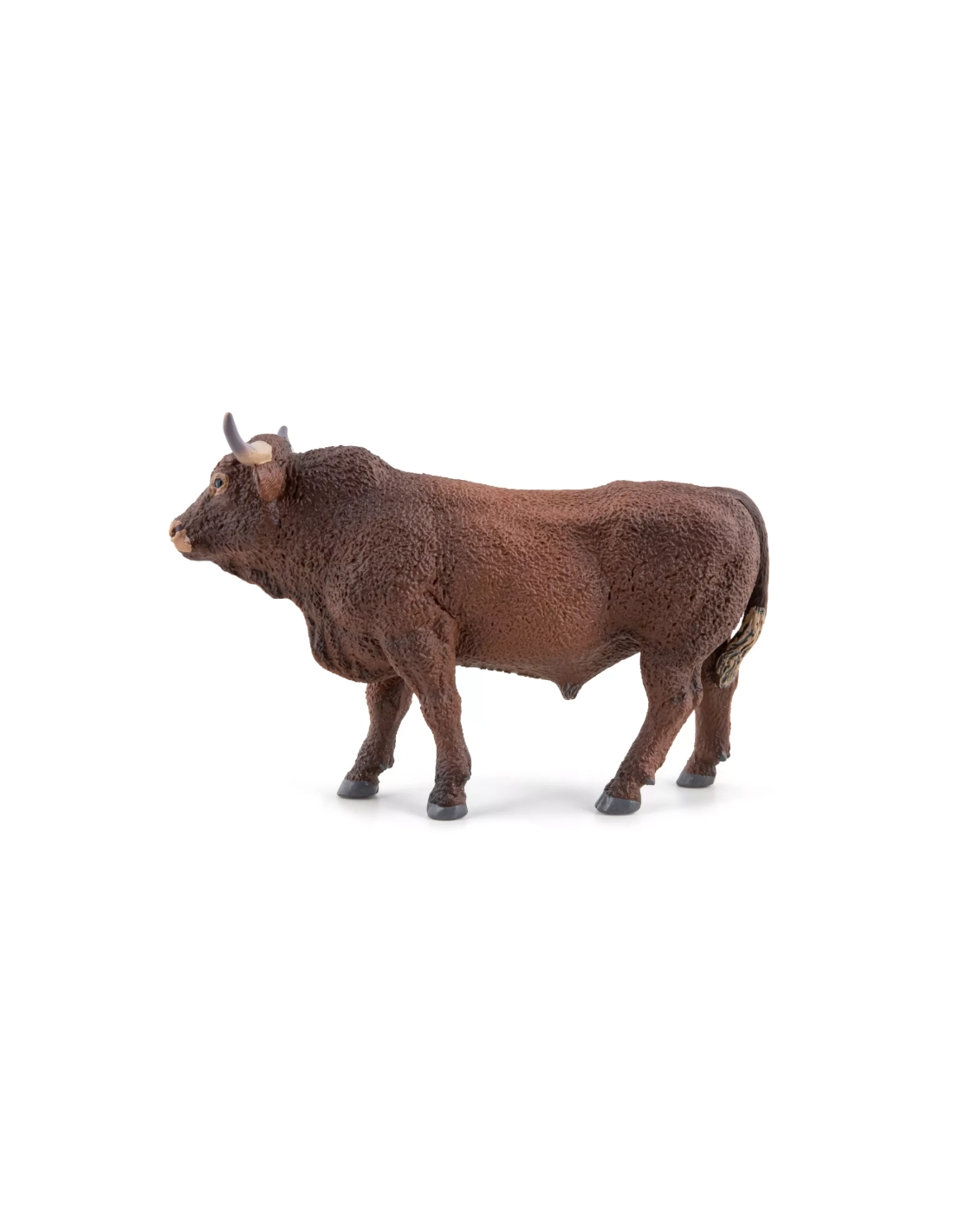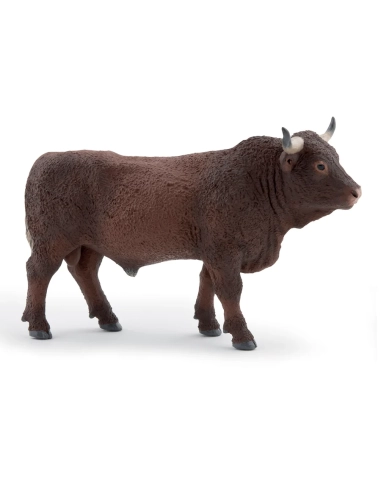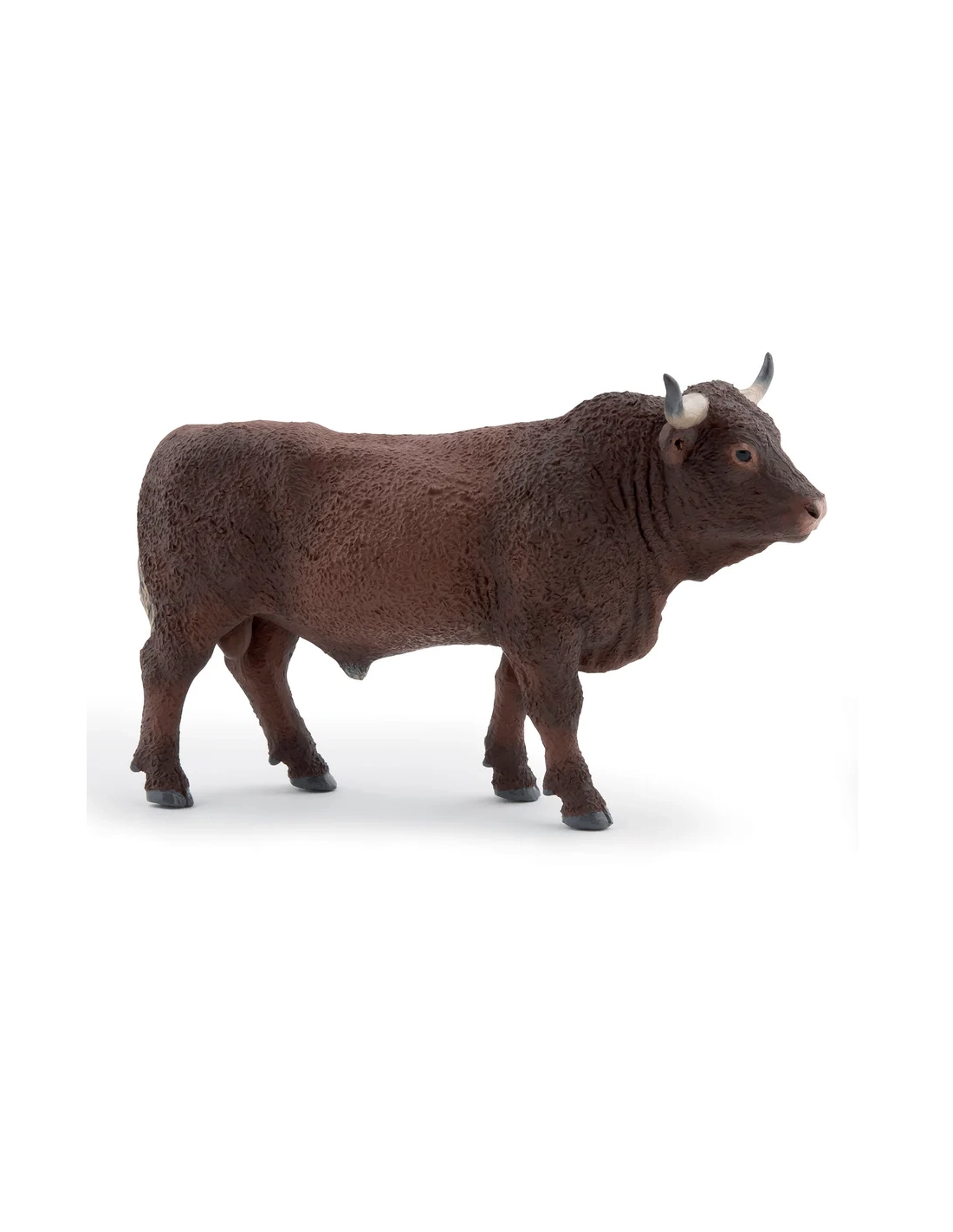 Le taureau montre une musculature marquée, un poil épais et une tête large typique de la race. Sa couleur rouge sombre uniforme et ses cornes claires permettent de le distinguer facilement d’autres bovins. Positionné en léger mouvement, il s’intègre parfaitement dans une scène de ferme, un pré de montagne ou un troupeau miniature.
