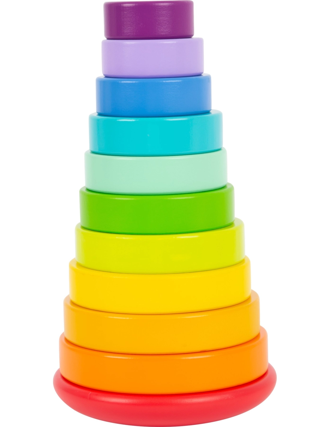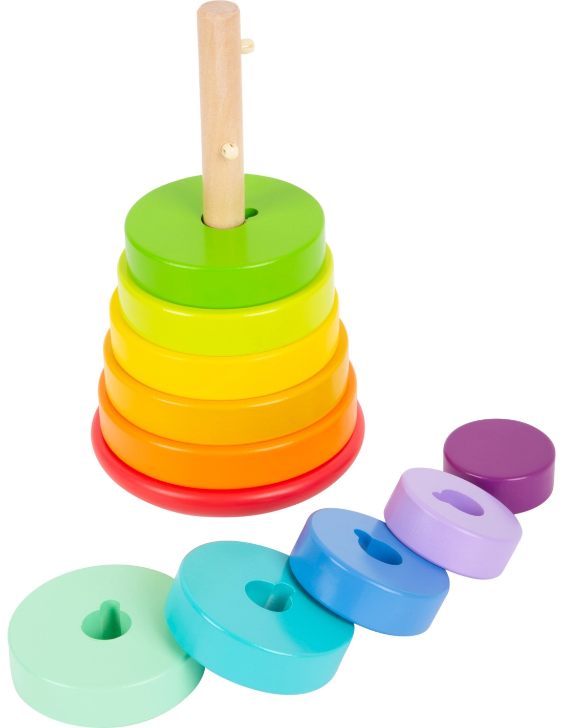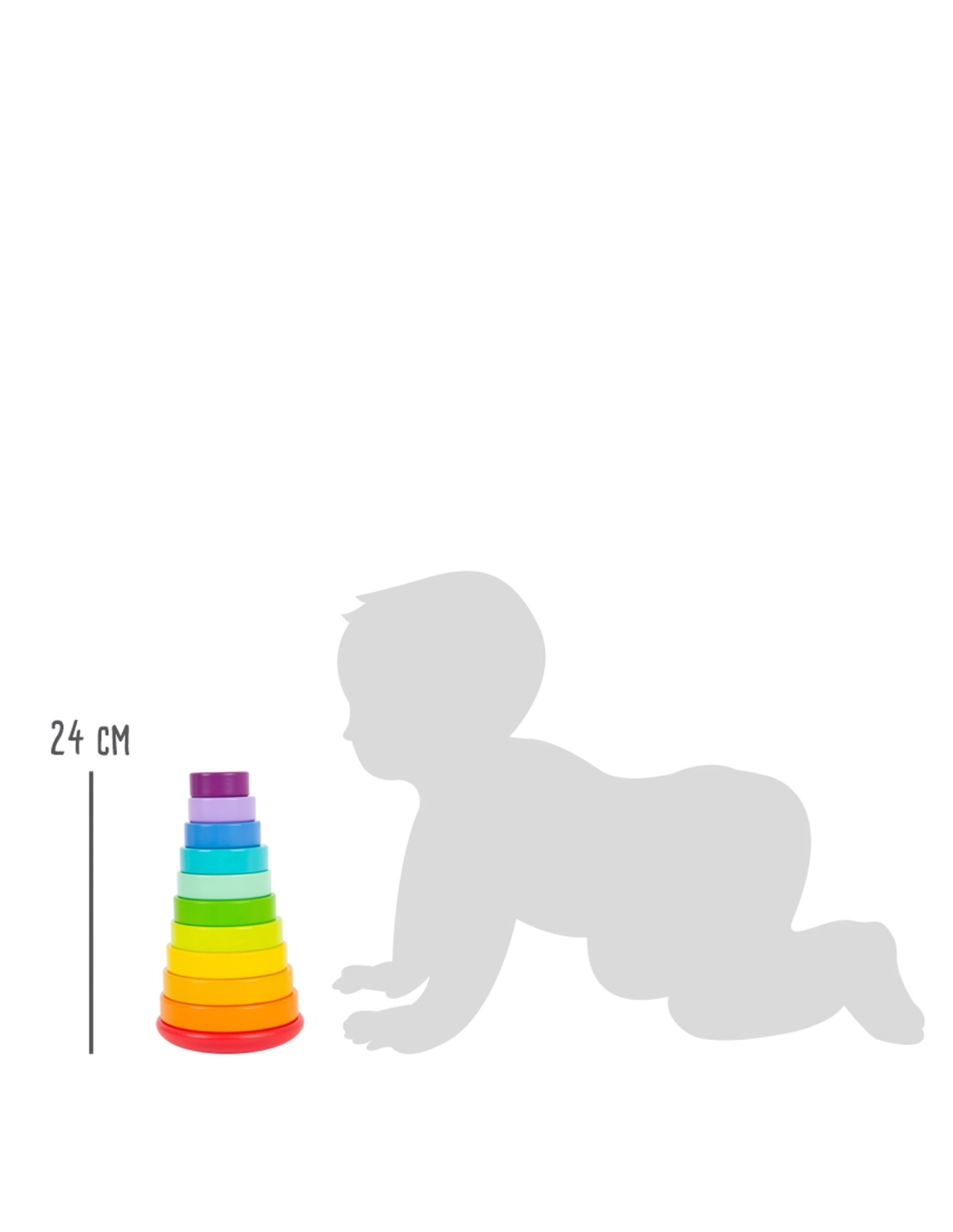 Cette tour arc-en-ciel propose 10 disques en bois à enfiler sur la tige avec une base vacillante. Pour proposer un travail de la motricité fine, celle-ci comporte des petits cônes sur la tige. L'enfant doit alors tourner pour que le disque s'encastre correctement.