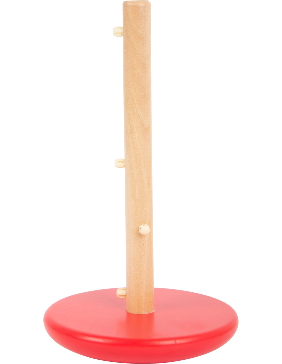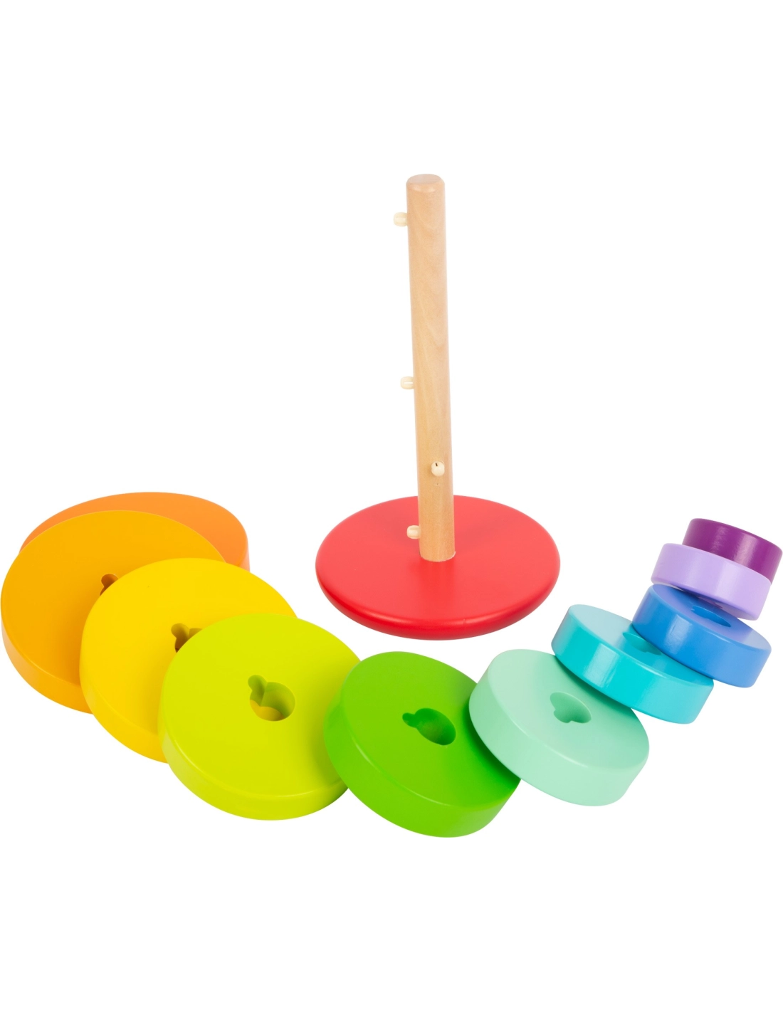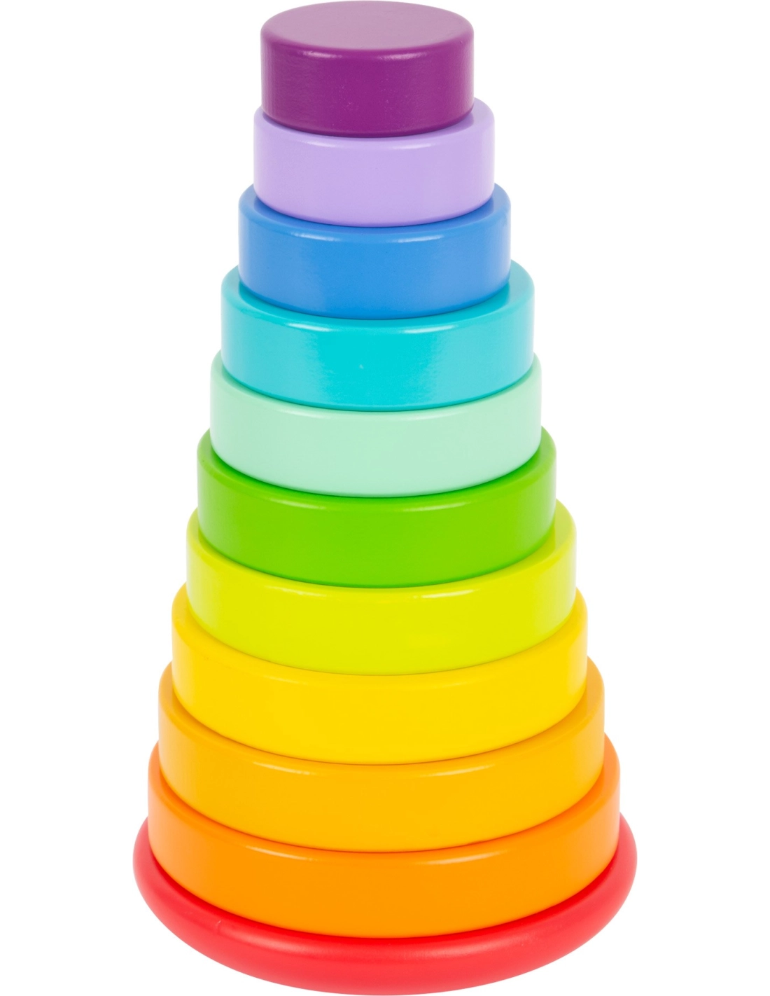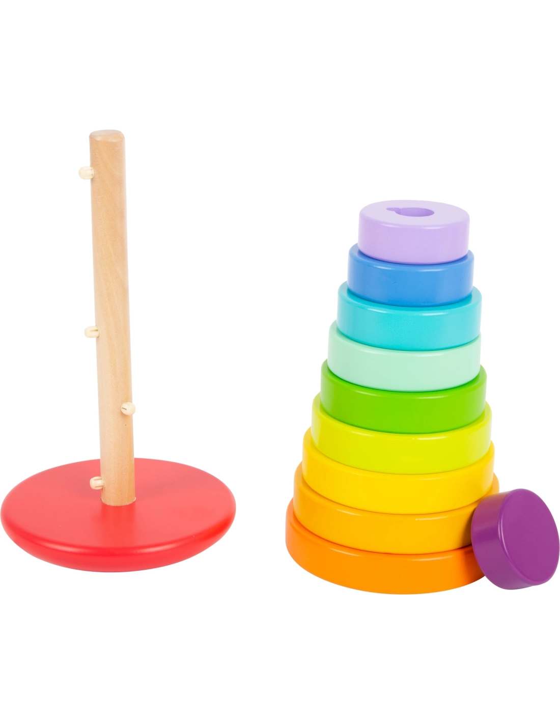 Cette tour arc-en-ciel propose 10 disques en bois à enfiler sur la tige avec une base vacillante. Pour proposer un travail de la motricité fine, celle-ci comporte des petits cônes sur la tige. L'enfant doit alors tourner pour que le disque s'encastre correctement.