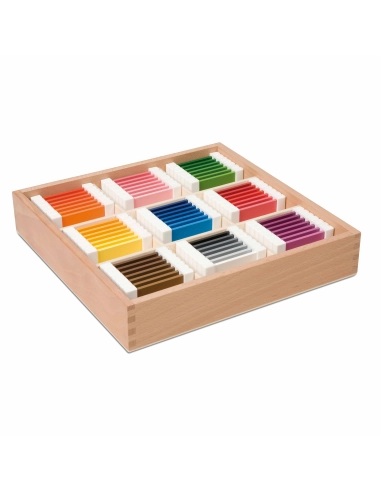 Un matériel Montessori composé d'une boîte et 63 tablettes. Avec la leçon en trois temps Montessori, l'enfant s'approprie le vocabulaire des couleurs. Vous pouvez lui proposer une activité Montessori de mise en paire, des jeux d'association avec objets du quotidien. Cet ensemble offre des couleurs secondaires...