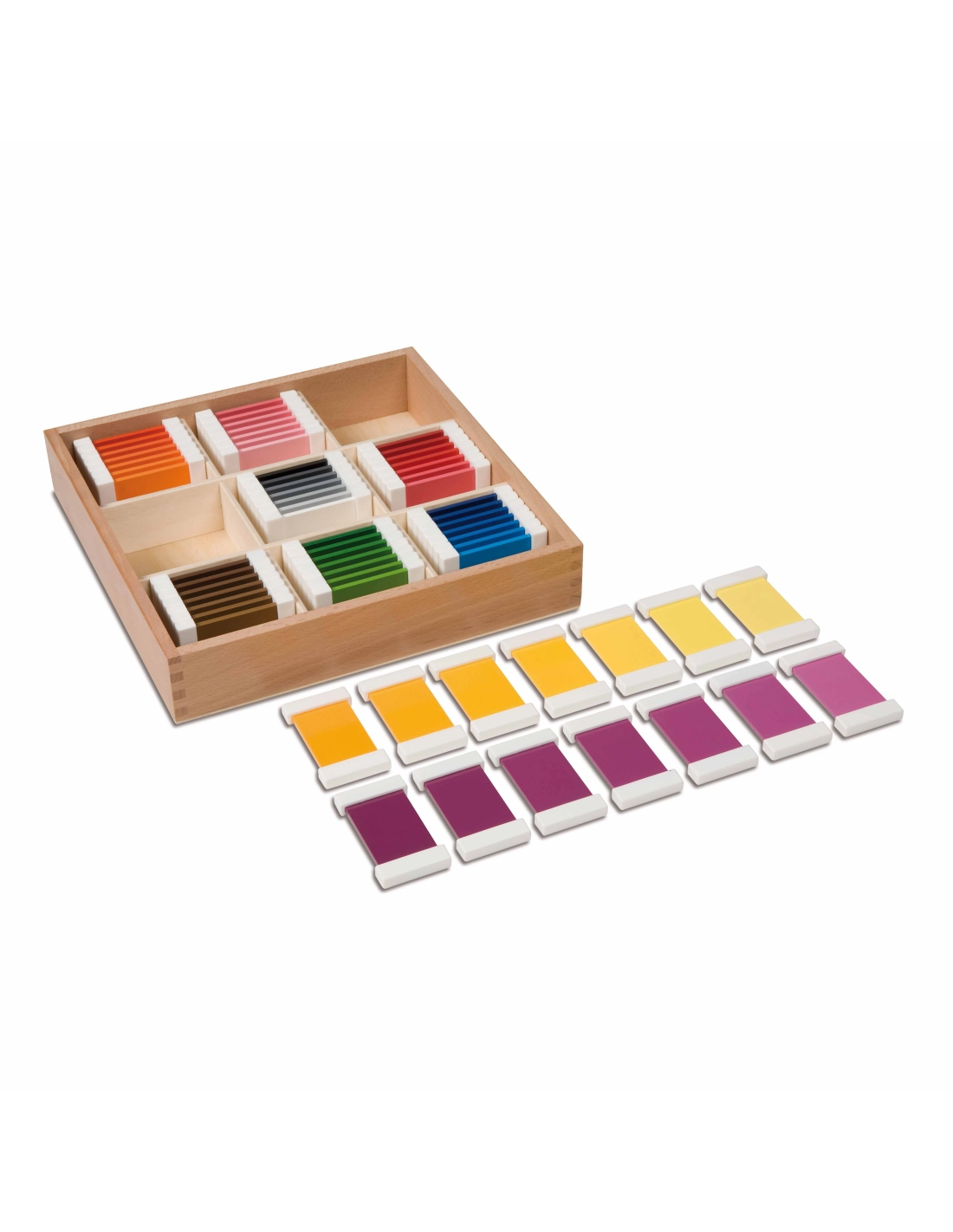 La deuxième boîte de tablettes de couleur introduit des couleurs secondaires et tertiaires ainsi que le vocabulaire des couleurs. La boîte contient 22 tablettes en bois, une paire par couleur: rouge, bleu, jaune, orange, vert, violet, marron, rose, gris, noir et blanc.