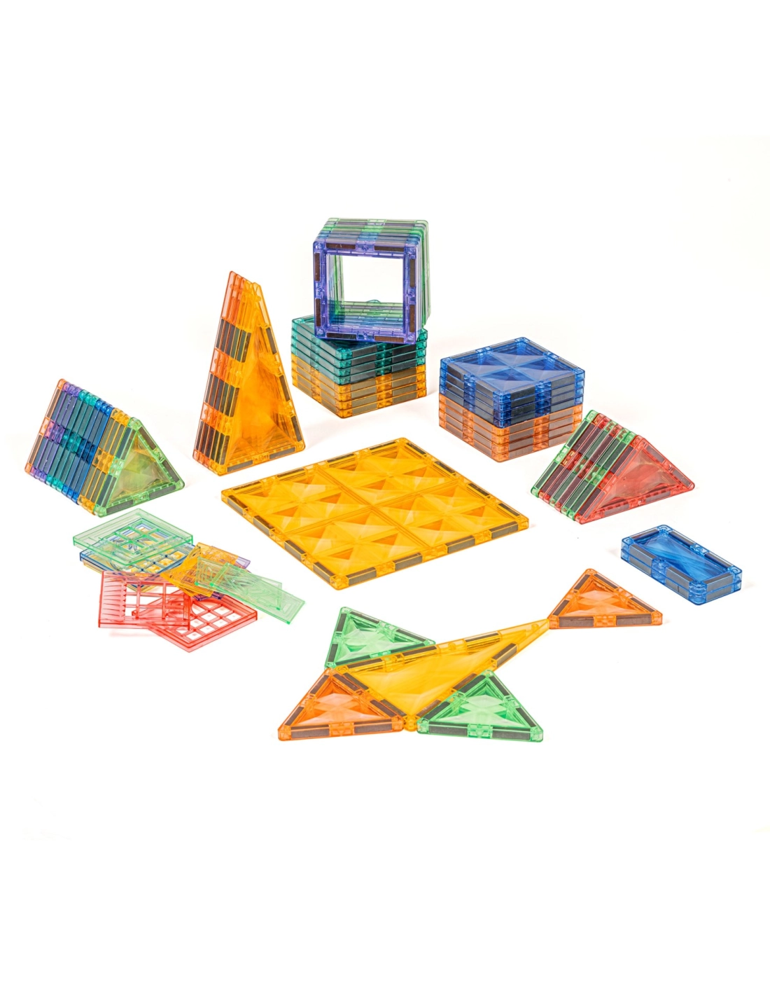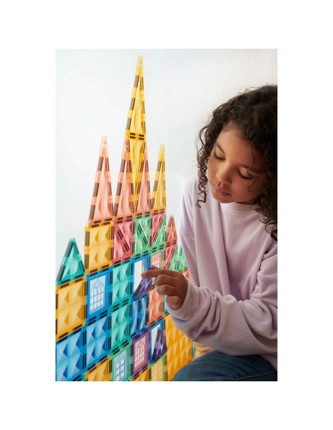 Le set Pastel est le plus doux et le plus poétique de la gamme MagGenius. Ses teintes translucides — rose, menthe, lavande, jaune beurre — ne crient pas : elles vibrent doucement contre la lumière. Et quand le soleil traverse les constructions, il projette des taches de couleur pastel sur le sol. Un effet qui n'existe dans aucun autre set de la gamme. Avec ses fenêtres encastrables, ses portes qui s'ouvrent et ses deux rectangles exclusifs, ce set est aussi celui du jeu narratif apaisé — les maisons habitées, les jardins clos, les palais de conte. Livret d'inspiration inclus.