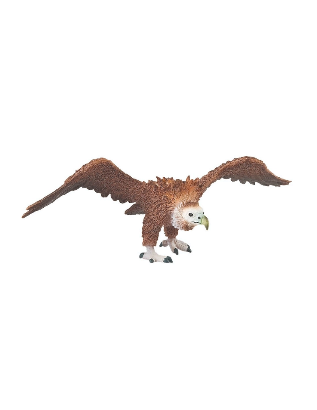 La figurine met parfaitement en valeur la collerette de plumes caractéristique qui entoure la tête de ce rapace. Cette adaptation morphologique exceptionnelle lui sert de protection thermique contre le froid et le vent des hautes altitudes où il évolue. Son plumage sombre, fidèlement reproduit ici, contraste avec sa tête déplumée, adaptation évolutive commune aux vautours qui facilite le nettoyage après les repas de charogne.