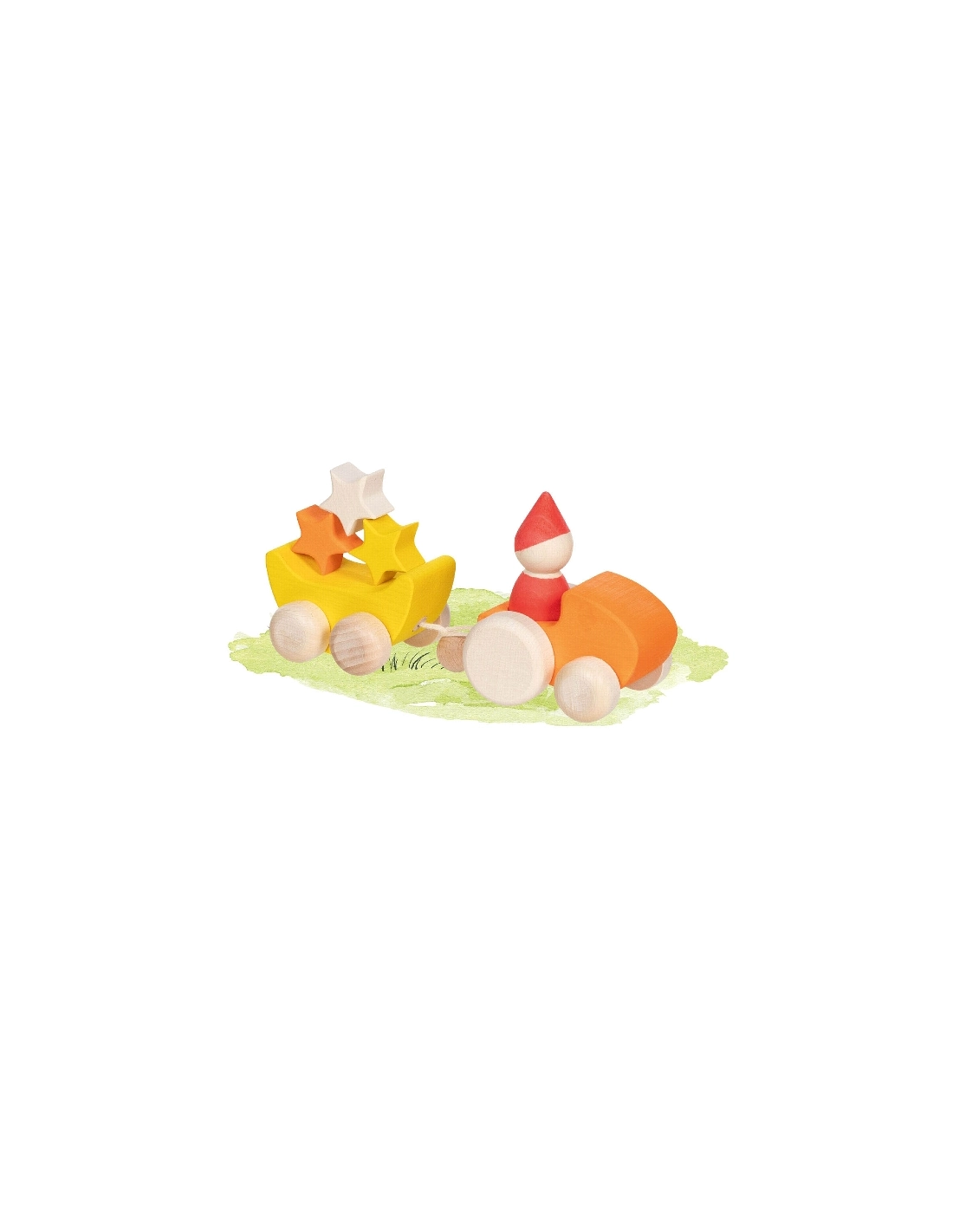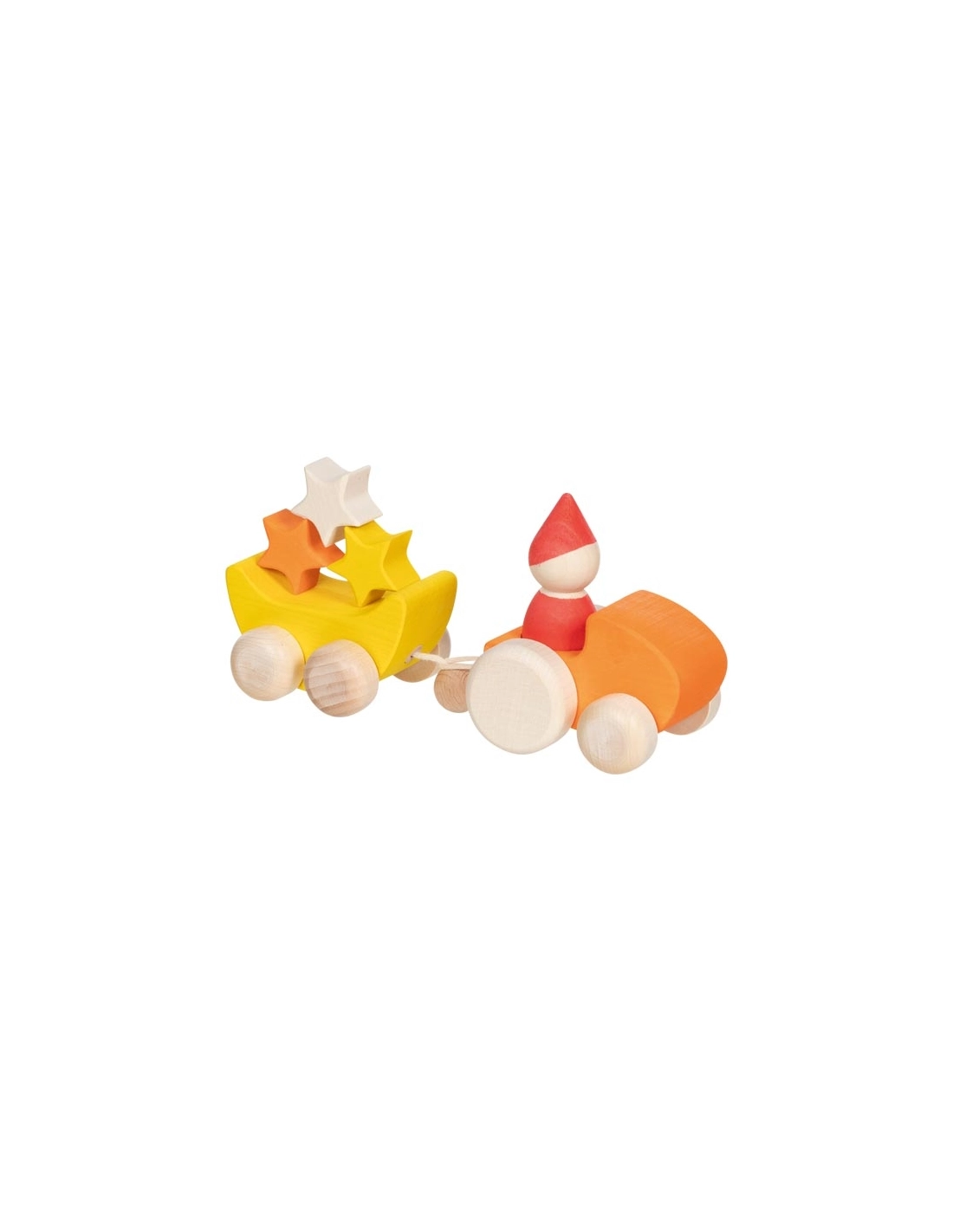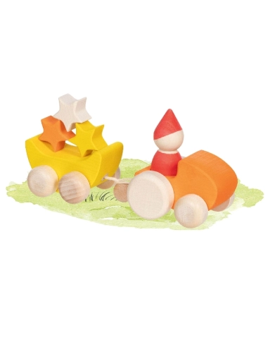 Ce set comprend un véhicule en bois, une figurine sans visage inspirée des pédagogies Montessori et Waldorf, et une remorque remplie de trois étoiles. L'enfant peut s'amuser à conduire le véhicule, à tirer la remorque et à inventer des histoires où le personnage transporte les étoiles à travers un univers imaginaire.
