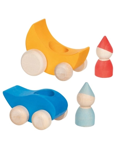 Avec leurs formes originales et leurs couleurs douces, ces véhicules font partie de ces jouets ouverts qui laissent libre cours à l'imagination. Goutte d'eau et croissant de lune créent un univers poétique propice aux histoires inventées.