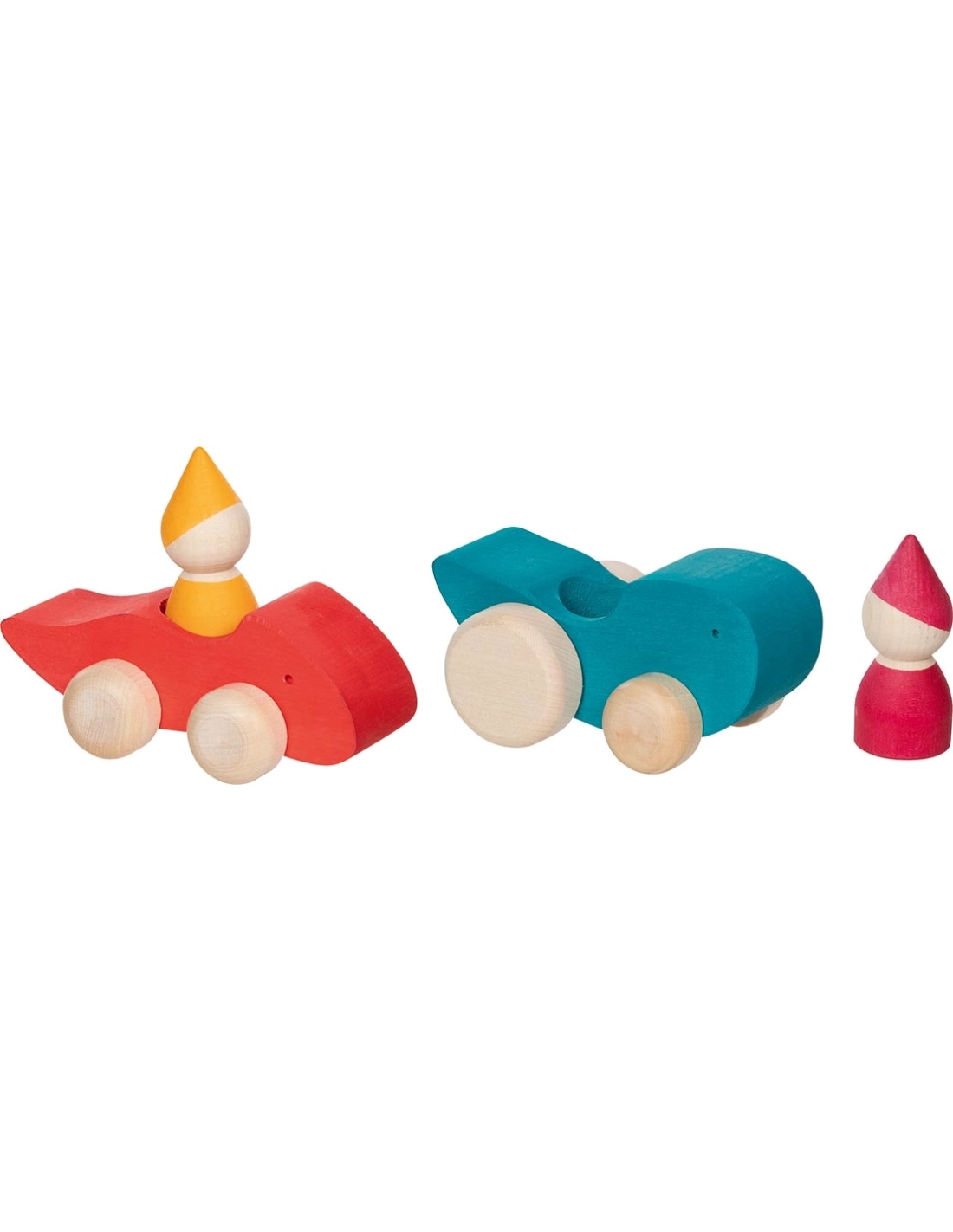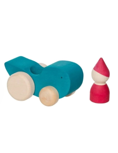 Cette voiture bleue en bois roule parfaitement et son personnage au bonnet rose se place facilement à l'intérieur sans être fixé. L'enfant peut le faire monter et descendre à volonté.